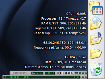 CoolMon displays vital system information in a small configurable window. Most of the application's data is retrieved from the Windows performance counters. It is able to display Processor usage, Number of Processes, Number of Threads, Used page file/Total page file, Used RAM/Total RAM, Computer Uptime, Date & Time, Computer name, All IP addresses, Network read and write speed, and Motherboard Monitor temperatures. It can do this locally as well a remotely over a LAN or the Internet.